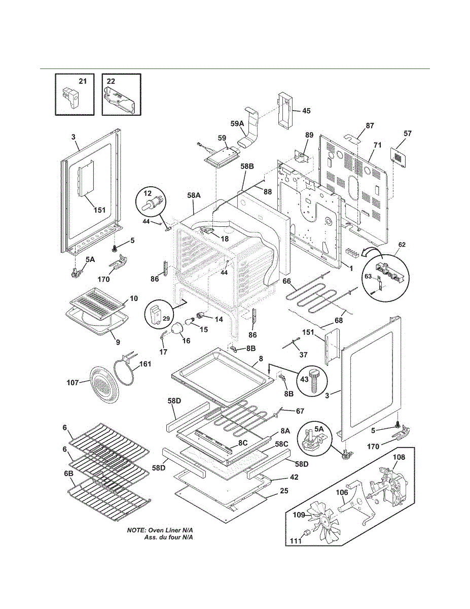 Bottom panel installs inside the oven cavity beneath the baking element. Replace if cracked, discolored, or damaged by melted foil or high heat exposure.