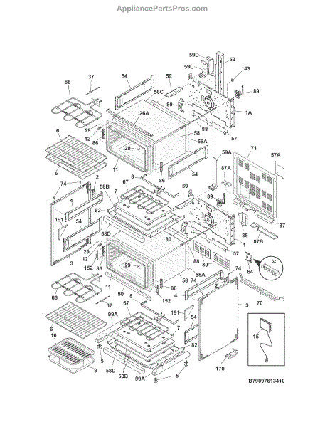 Broiler pan for electric and gas ranges. Installs in oven cavity for broiling. Replace if cracked, warped, rusted, or heavily stained beyond cleaning.