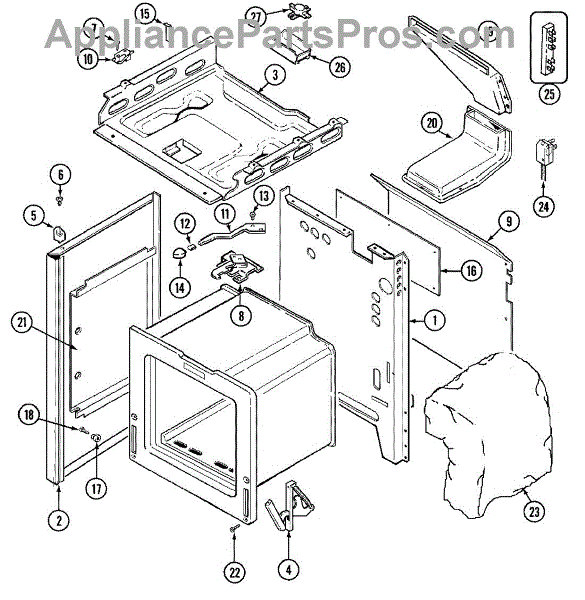 This factory screw secures appliance components to their mounting points. Replace missing, worn, or stripped hardware to restore a tight fit, proper alignment, and quieter operation across the affected assembly.