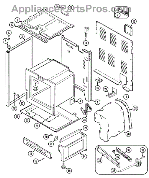 Anti-tip bracket bolts to the floor behind your range to prevent tipping. Replace if missing, bent, or damaged during moving or installation.