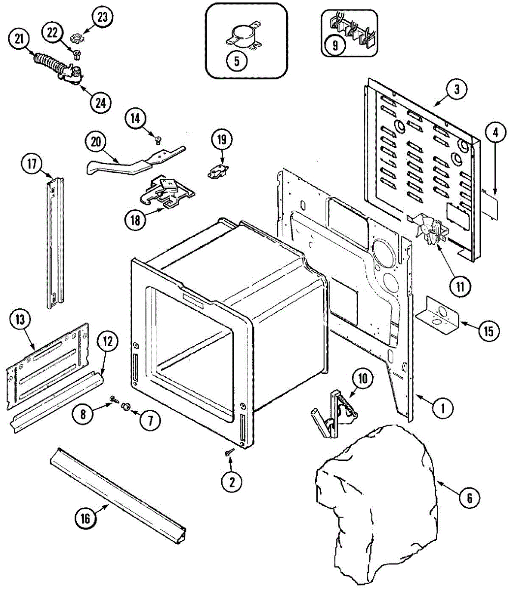 Insulation panel that installs at the back of the oven cavity. Replace if original insulation is cracked, damaged, deteriorated, or missing.