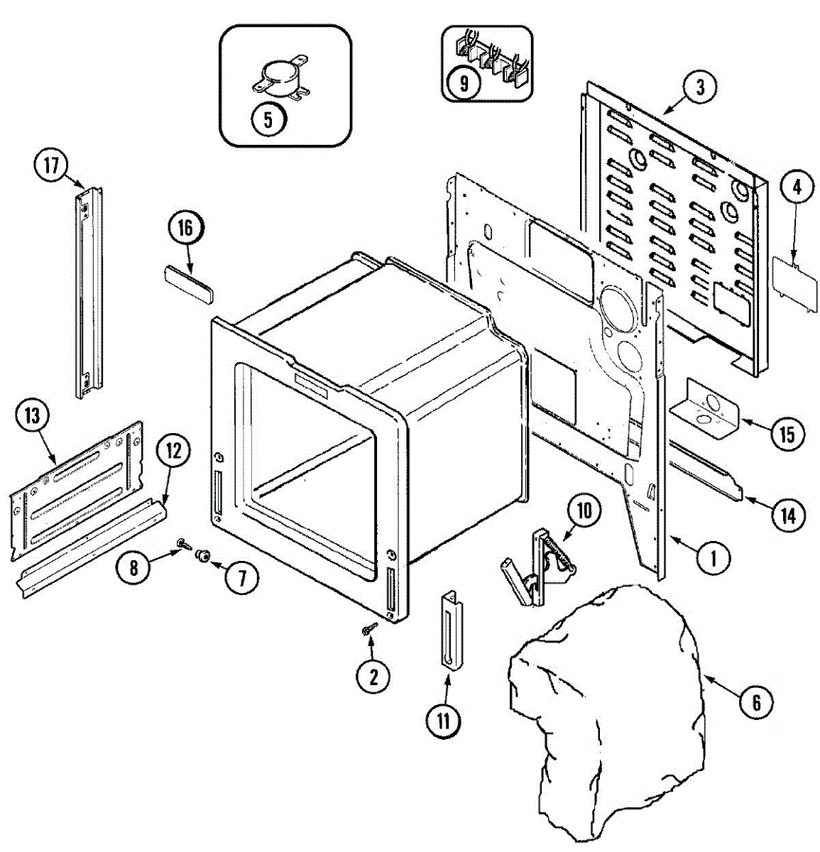 Insulation panel that installs at the back of the oven cavity. Replace if original insulation is cracked, damaged, deteriorated, or missing.