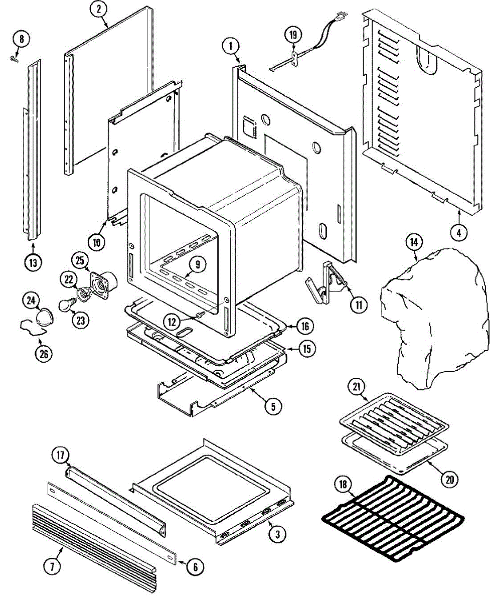 Insulation panel that installs at the back of the oven cavity. Replace if original insulation is cracked, damaged, deteriorated, or missing.