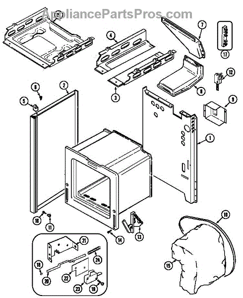 This burner box is the oven's metal housing that holds and positions the bake/broil burners and channels gas flames for proper heating. Replacing a damaged box restores safe flame direction and consistent oven operation. What it does