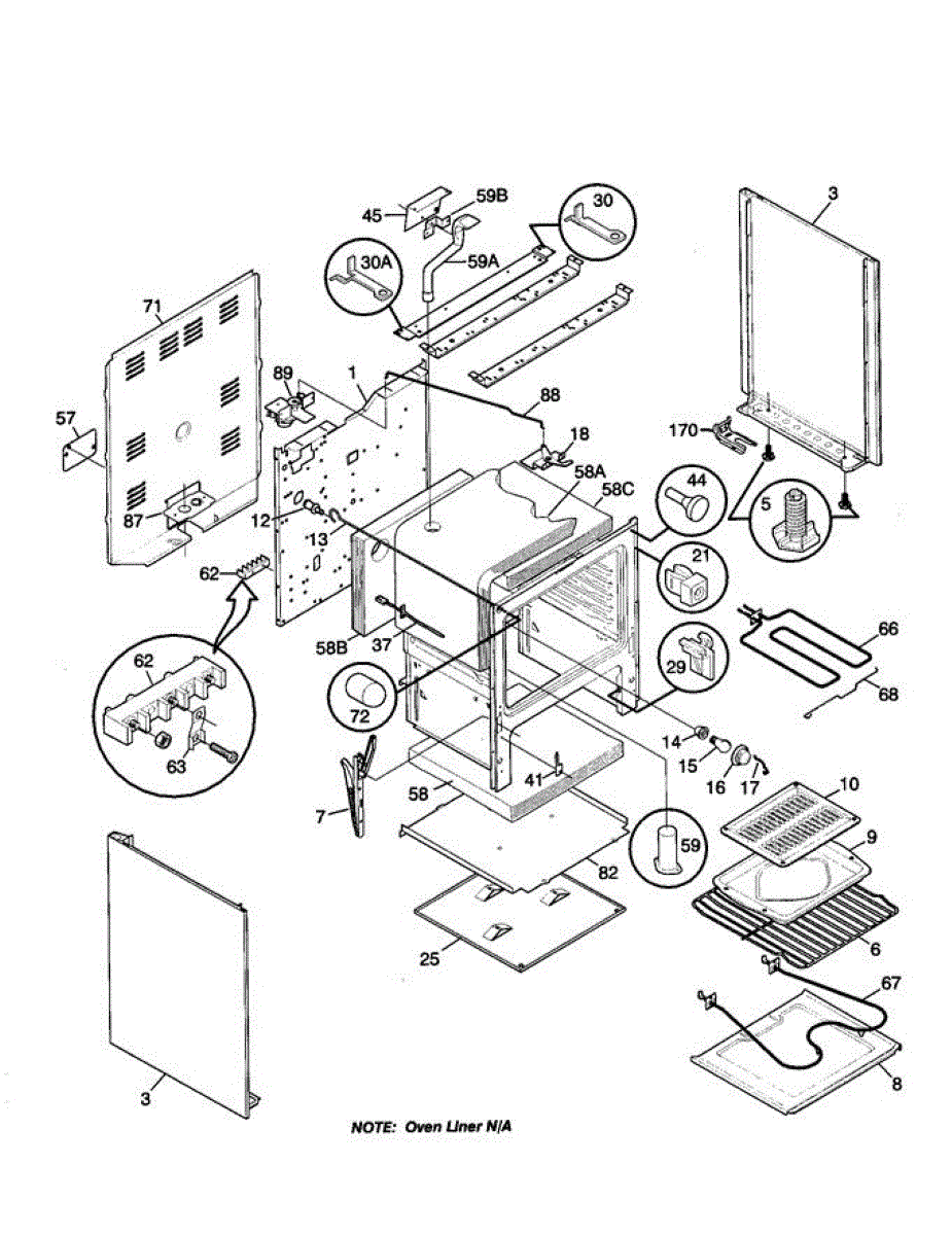 Insulation blanket surrounds the oven cavity to retain heat. Replace if burnt, deteriorated, or damaged by pests to restore proper heat retention.