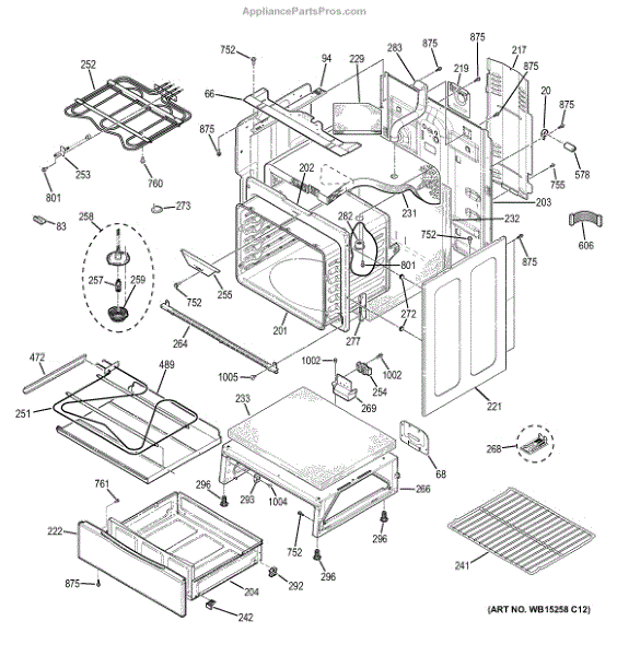 Replaces the welded rear and side oven cavity structure in black finish. Needed when the body assembly is cracked, damaged, or structurally compromised.