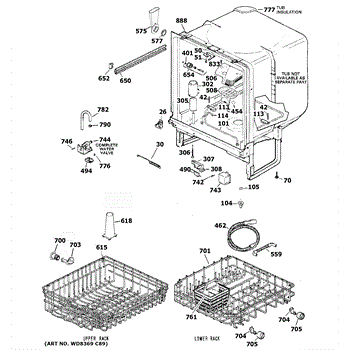 The Upper Rack is an OEM replacement part for GE dishwashers. It provides movable shelf space along the top of the dishwasher interior for washing plates, bowls, and other dishes. The shelves feature an adjustable design that accommodates various sizes and configurations of dishware. Causes of failure include normal wear and tear, accidental impacts that damage shelves or cleaning chemicals stripping away protective coatings. Symptoms of a bad upper rack can include: