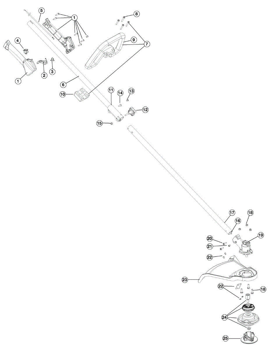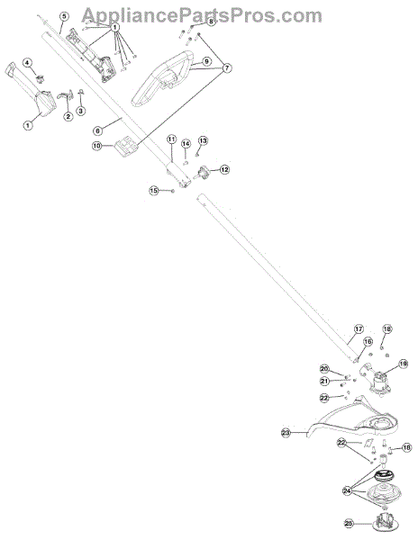 24.932" boom assembly for gas line trimmers. Includes internal drive shaft. Replace if boom tube is bent, cracked, or damaged from impact or wear.