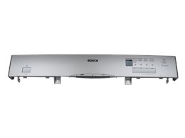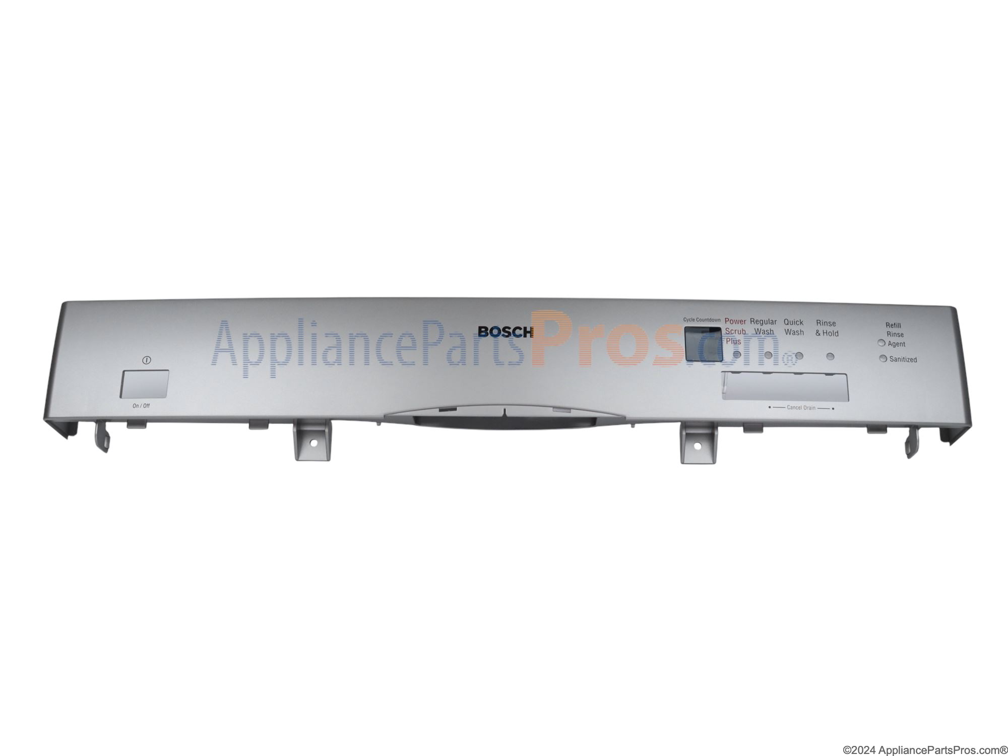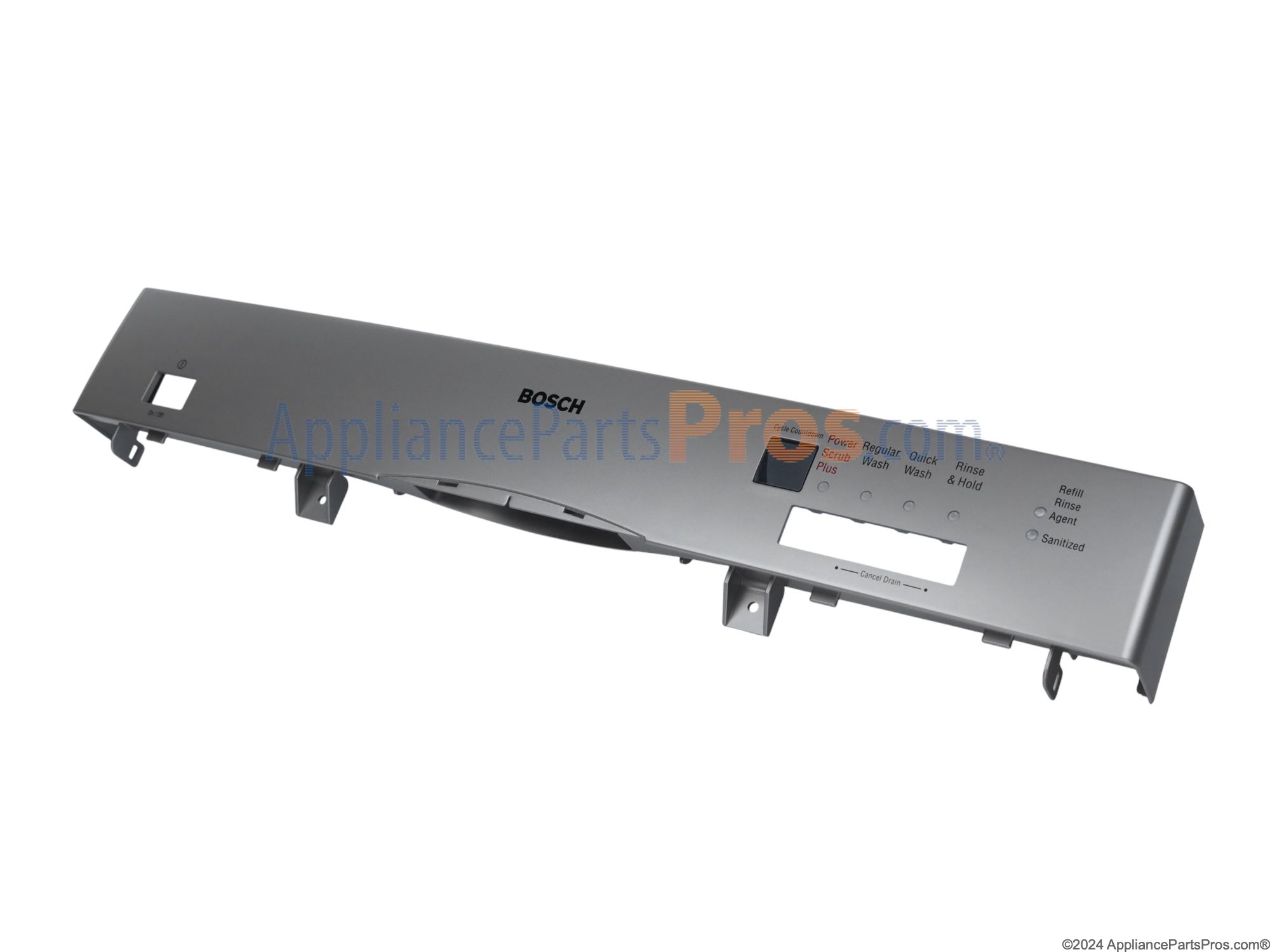 The Control Panel is an OEM part for Bosch dishwashers. Located at the top of the dishwasher door, the control panel includes push buttons and digital displays to allow for programming cycles, adjusting settings, monitoring status, and starting/stopping the unit.