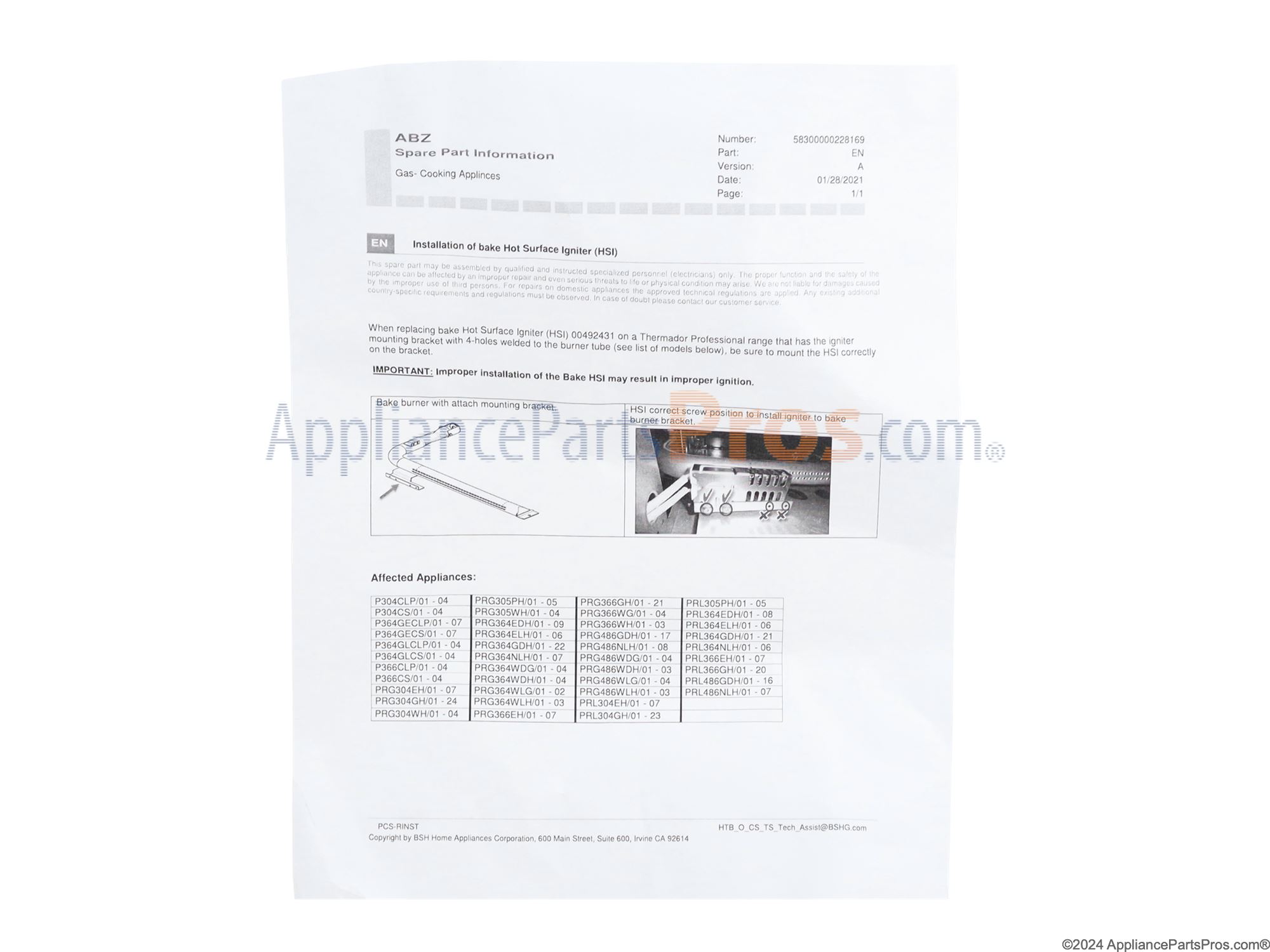 Mitchel E Hackensack , NJ January 31, 2022 Appliance: Model HGS505UC/01 Oven igniter another successful repair Another successful repair! Bosch HGS505UC/01 oven-range had a failed oven igniter (oven, NOT broil igniter). The Bosch Service Manual indicated p/n 00492431 as a replacement. Although the Appliance Parts Pros online compatibility checker indicter this p/n was not compatible with this model, it truly is the correct p/n. Ordered the igniter on Thursday morning and promptly received it on Friday via Standard Shipping. It took more time move the oven-range (and clean behind it!) than it did to actually replace the part. Simple and straightforward. Oven is now 100% restored. Appliance Parts Pros is my go-to for parts. Over the last 5 years I've repaired our washer, dryer, and fridge. And now our oven-range. All thanks to Appliance Parts Pros! Read More... 1 People found this story helpful Do-It-Yourself Rating: Repair Time Estimate: 15-30 minutes Tools: Nut Drivers, Screwdrivers