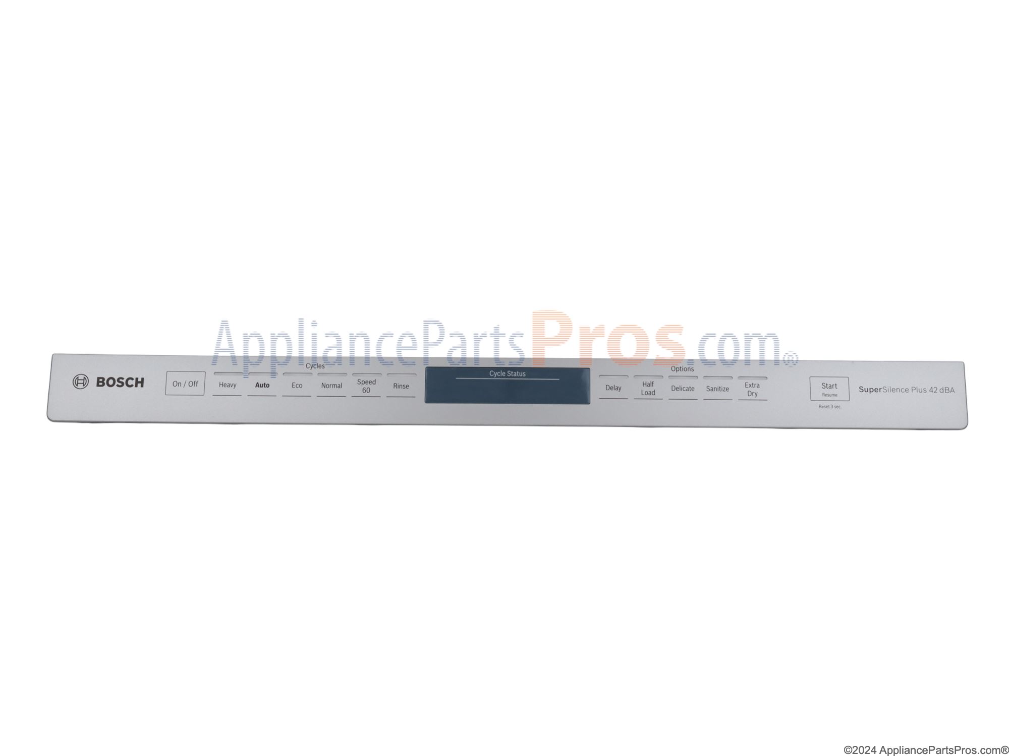 The Facia Panel is an OEM part for Bosch dishwashers. As the central interface, the facia panel houses all function buttons, cycle/option selectors, and status LED lights. The facia maintains a sleek appearance while clearly presenting settings. Integrated controls allow for customized washes tailored to any load. Causes of a bad facia panel can occur from normal wear and exposures over time. Thousands of touches and cycles introduces potential moisture intrusions. Accidental spills or splashes may corrode or deteriorate components. Symptoms of a bad facia panel include: