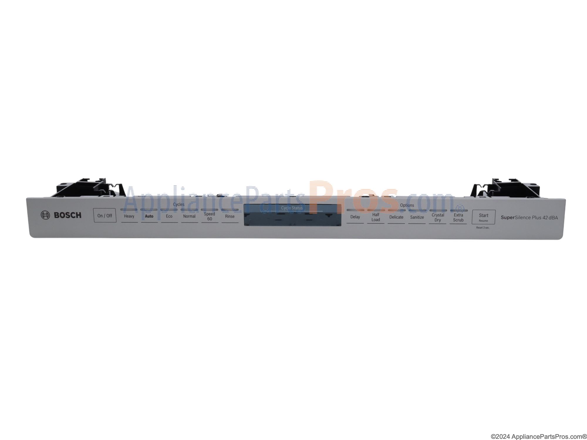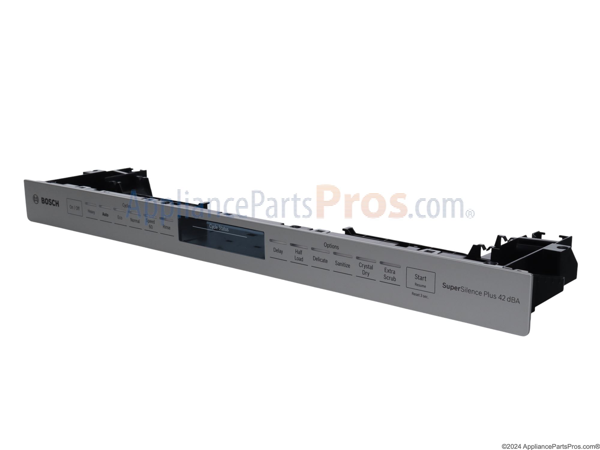 The Facia Panel is an OEM part for Bosch dishwashers. As the central interface, the facia panel houses all function buttons, cycle/option selectors, and status LED lights. The facia maintains a sleek appearance while clearly presenting settings. Integrated controls allow for customized washes tailored to any load. Causes of a bad facia panel can include normal wear from thousands of touches over the years. Exposure to steam and detergents may deteriorate electronics or graphics over time as well. Accidental impacts pose a hazard. Symptoms of a bad facia panel include: