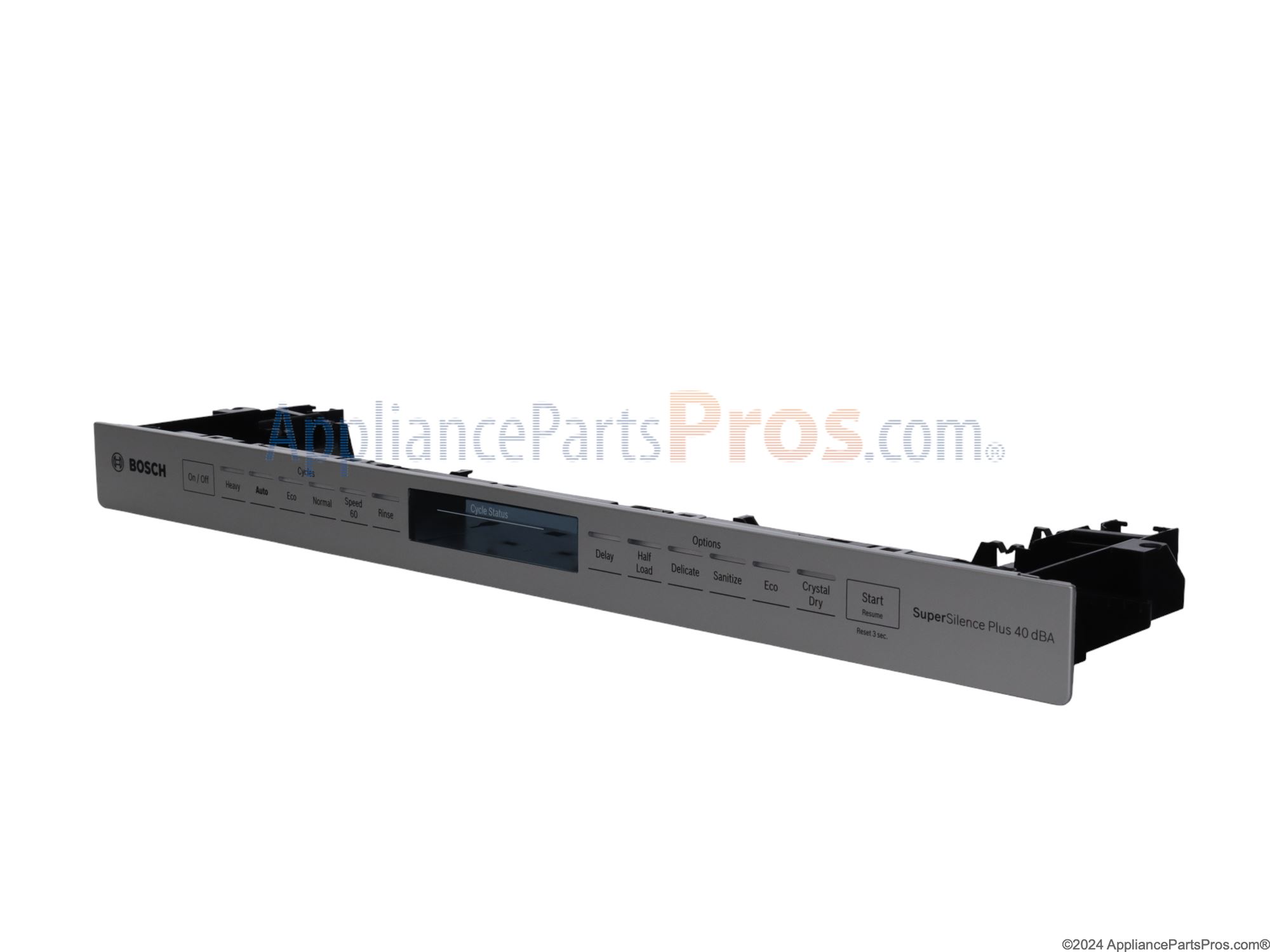 The Panel Facia is an OEM component specifically designed for Bosch dishwashers. It is the outer facade that covers the front of the dishwasher and includes features like the control panel, branding/logo display, and any touchscreen or button interfaces.
