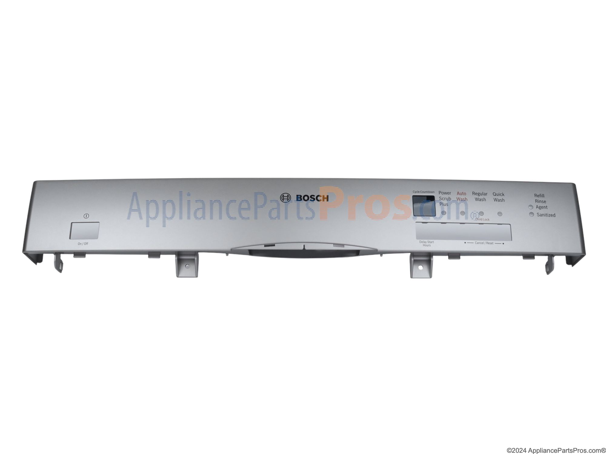 The Facia Panel is an OEM part for Bosch dishwashers. This panel is the interface hub for the dishwasher, featuring controls and indicators for the various functions of the appliance. It's essential for ensuring that users can select the appropriate settings for their dishwashing needs.