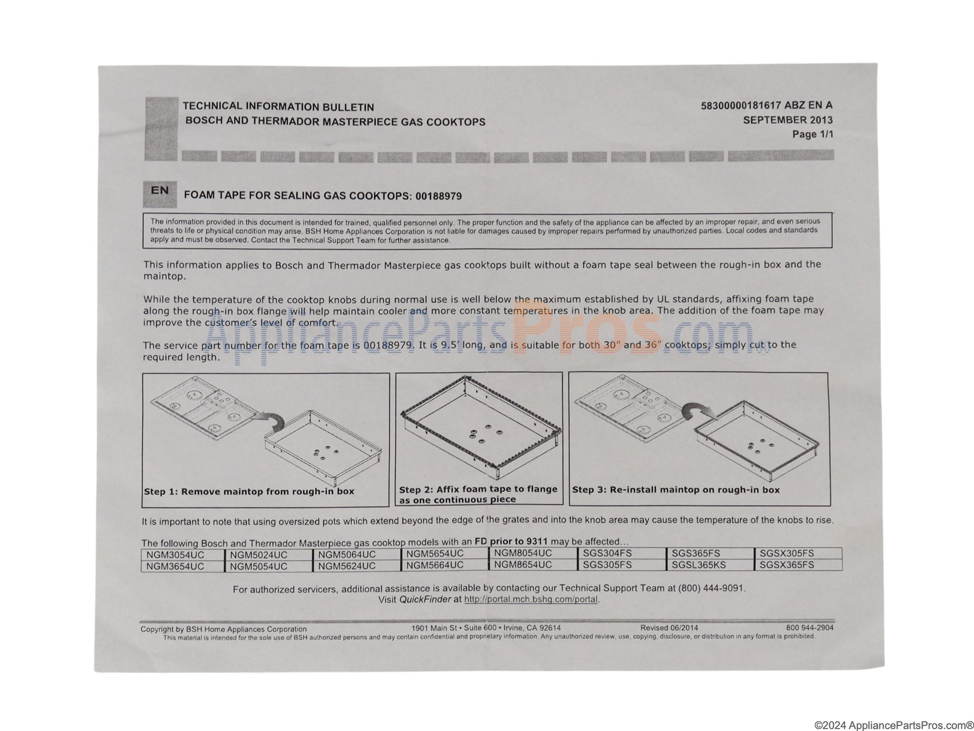The Tape, Foam is an OEM part for Bosch cooktops. This foam tape creates a tight seal between the cooktop surface and surrounding countertop. It helps contain spills and keeps external surfaces heat-isolated.