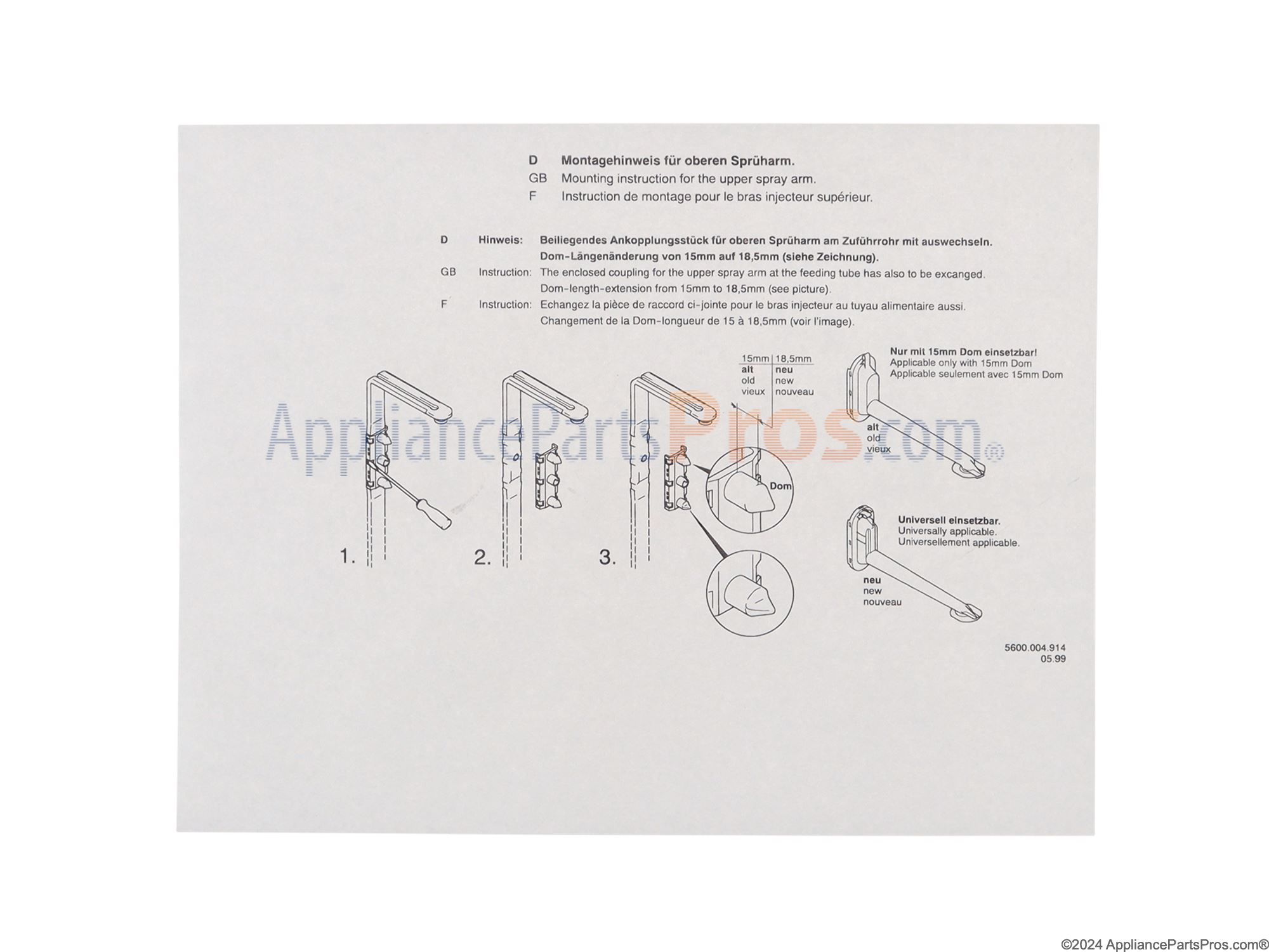 Dorman P Ponte Vedra Beach , FL October 18, 2014 Appliance: Model BOSCH SHY66C05UC/14 Dishes were not getting clean After we saw that progressively our dishes were not getting clean we investigated the condition of the spray arms and this upper feed tube assembly. We found a huge crack on the side of this piece and new not enough water was getting to the arms. We also noticed a build up of soap and lime. So we ran a cycle of vinegar and sprayed the filters and arms with lime-off-sprayed them out with a air hose "completely". Many of the small pieces of lime will clog the holes in the spray arms. Attached the new upper feed tube and it is like we have a new dishwasher! no more coffee rings and starchy plates and glasses. Clean Clean sparkling dishes! I continue to get quick dependable service from Applianceparts Pro-even if I find it cheaper elsewhere, I always buy here because I get it lightning fast and always the right part. ( torx screwdriver needed) Read More... 4 People found this story helpful Do-It-Yourself Rating: Repair Time Estimate: Less than 15 minutes Tools: Screwdrivers