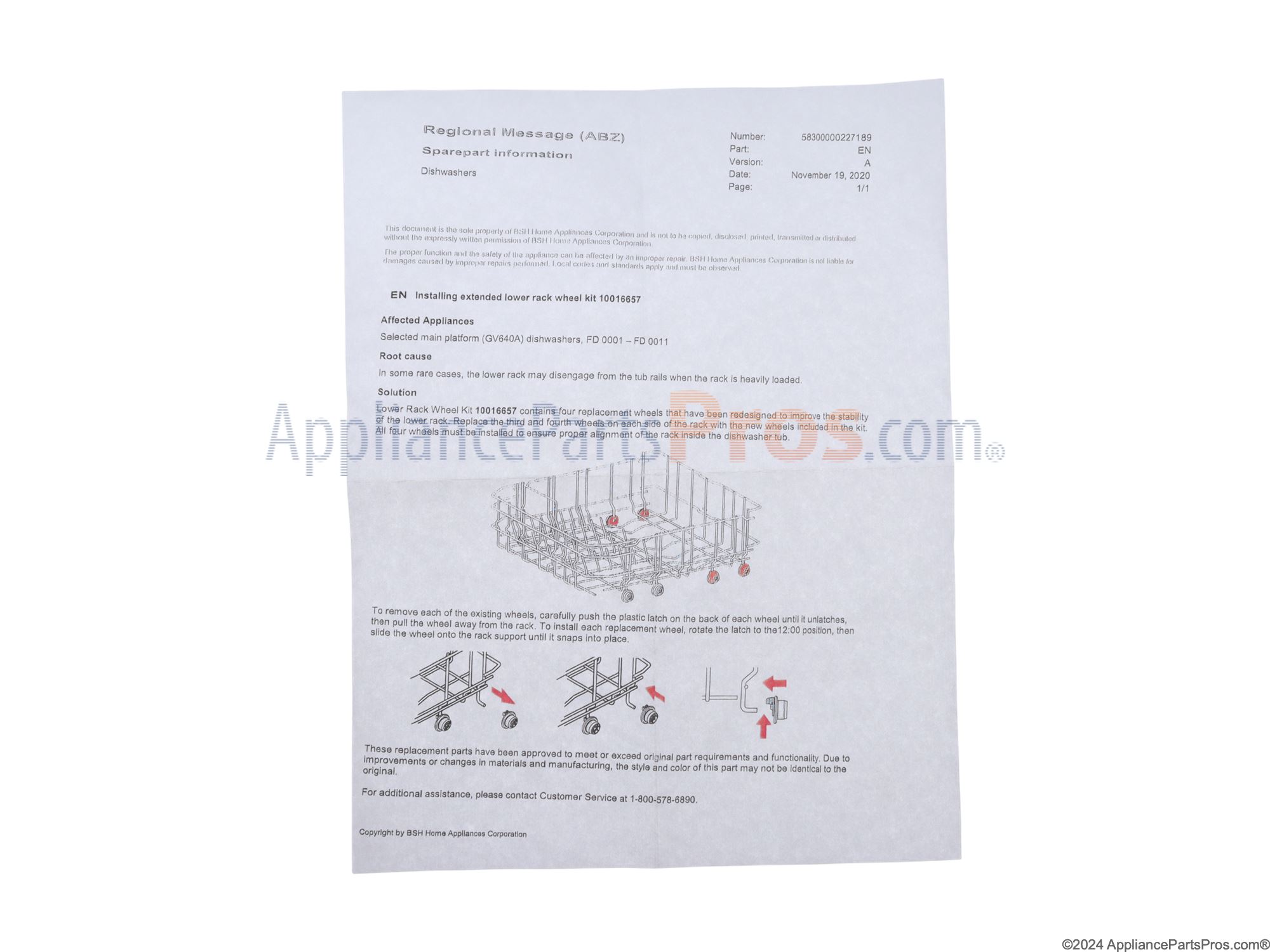 This is a package of 4 wheels. The lower wheel kit is an OEM part for Bosch dishwashers. This lower wheel kit is designed to smoothly guide dishes in and out of the dishwasher. Causes of a bad wheel can include wear and tear over time, cracks or breaks in the rollers, misalignment preventing proper motion, or material degradation allowing for stickiness or gumming. Symptoms of a bad wheel include: