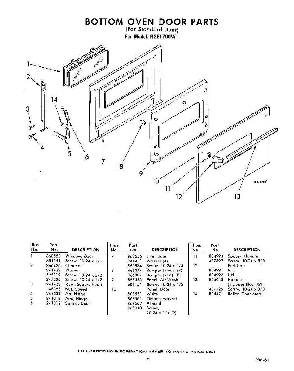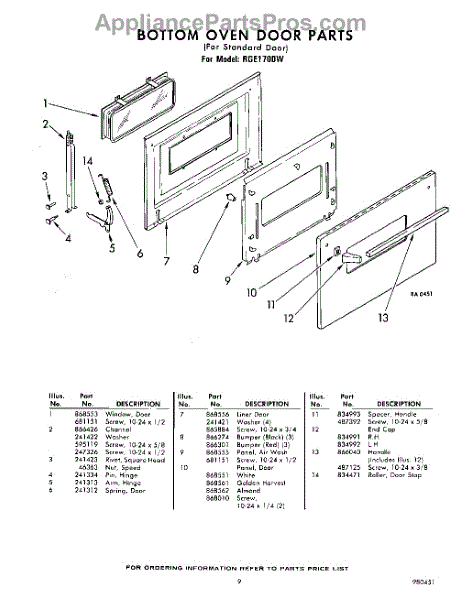 Parts for Whirlpool RGE1700PW: 09 - Bottom Oven Door(For Standard Door) Parts