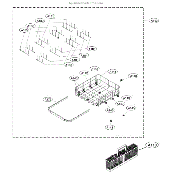 The Rack is an OEM part for LG dishwashers. It provides an adjustable configuration of prongs and wires to effectively wash a variety of dirty dishes. As the main washing component inside the dishwasher, the rack is purposely designed to lift and tilt dishes to maximize water coverage.