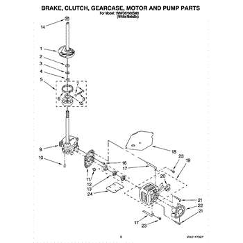 Secures the drain pump to the motor in direct drive washers. Replace if cracked, broken, bent, or missing to properly mount the pump and prevent misalignment.