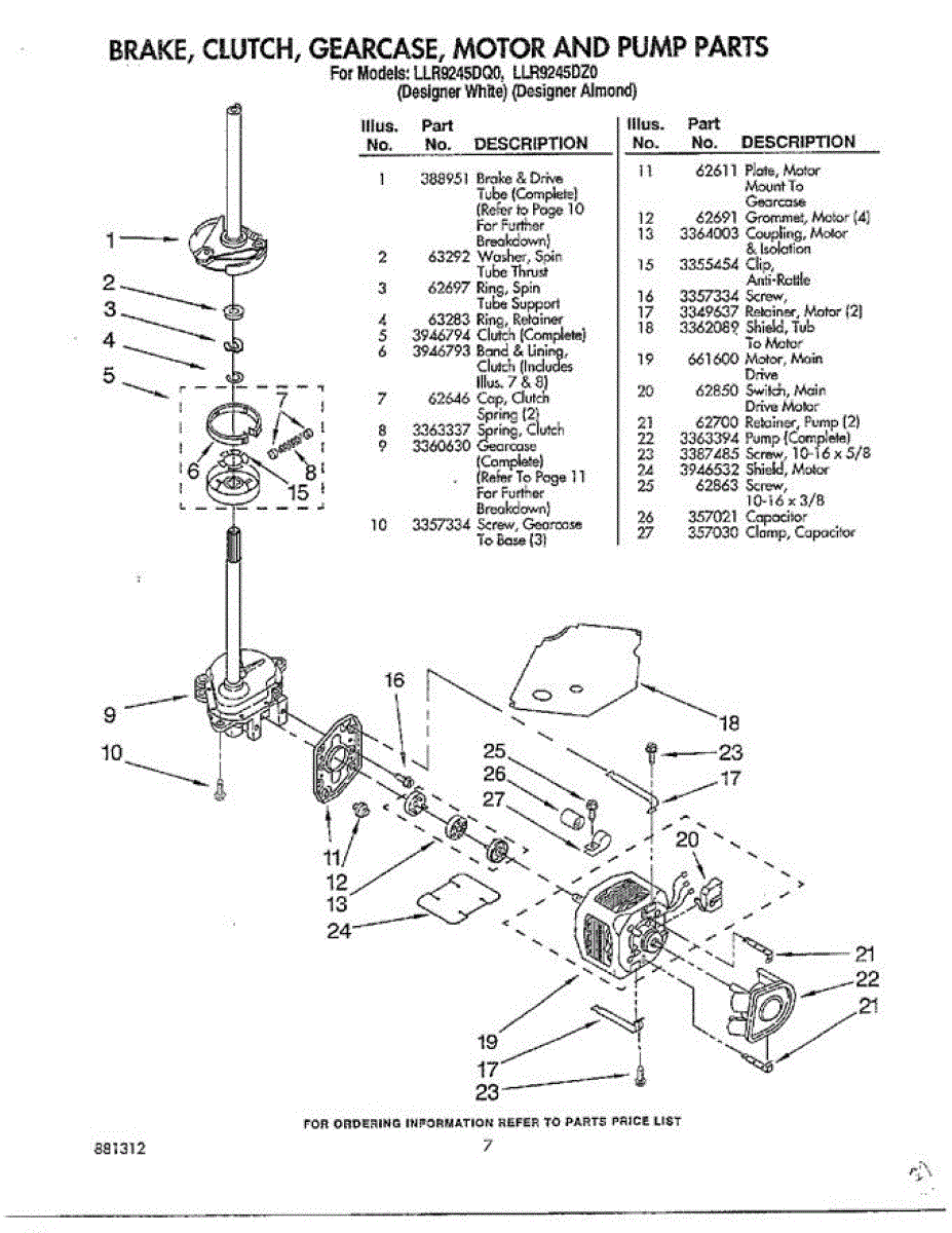 Parts for Whirlpool LLR9245DZO: Brake / Clutch / Gearcase / Motor And Pump Parts