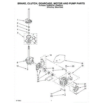 Secures the drain pump to the motor in direct drive washers. Replace if cracked, broken, bent, or missing to properly mount the pump and prevent misalignment.