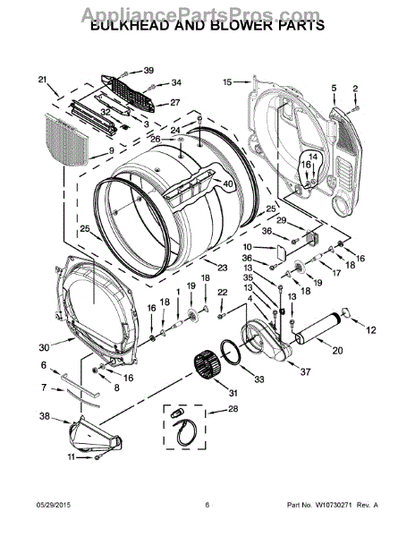• Commonly replaced for reduced airflow, longer dry times, or unusual noise from the rear of the dryer