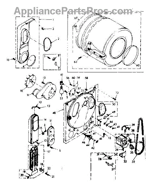 Complete drum assembly for dryers. Houses and rotates laundry during cycles. Replace if cracked, warped, damaged, or worn from extended use.