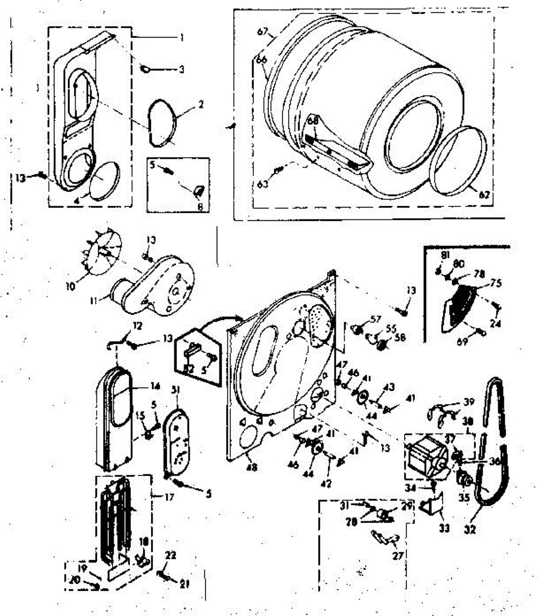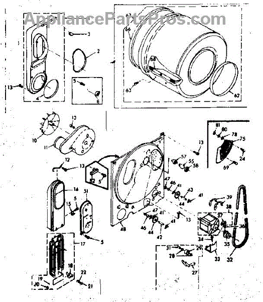 Complete drum assembly for dryers. Houses and rotates laundry during cycles. Replace if cracked, warped, damaged, or worn from extended use.