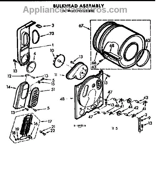 Replacement drum front bulkhead for dryers. Installs at the front of the drum assembly. Needed when original is cracked, damaged, or worn out.