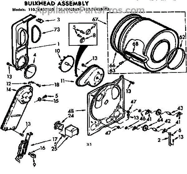 Replacement drum front bulkhead for dryers. Installs at the front of the drum assembly. Needed when original is cracked, damaged, or worn out.