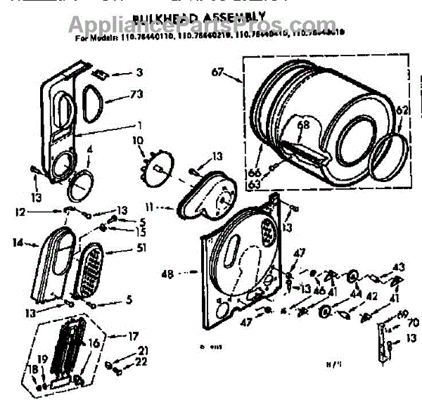 Replacement drum front bulkhead for dryers. Installs at the front of the drum assembly. Needed when original is cracked, damaged, or worn out.