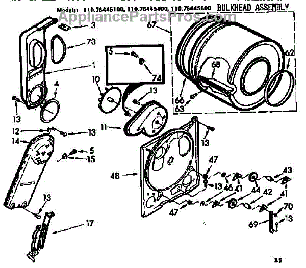Replacement drum front bulkhead for dryers. Installs at the front of the drum assembly. Needed when original is cracked, damaged, or worn out.