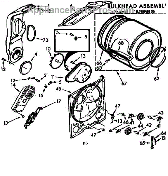 Replacement drum front bulkhead for dryers. Installs at the front of the drum assembly. Needed when original is cracked, damaged, or worn out.