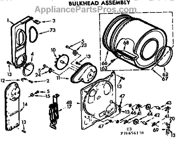 Replacement drum front bulkhead for dryers. Installs at the front of the drum assembly. Needed when original is cracked, damaged, or worn out.