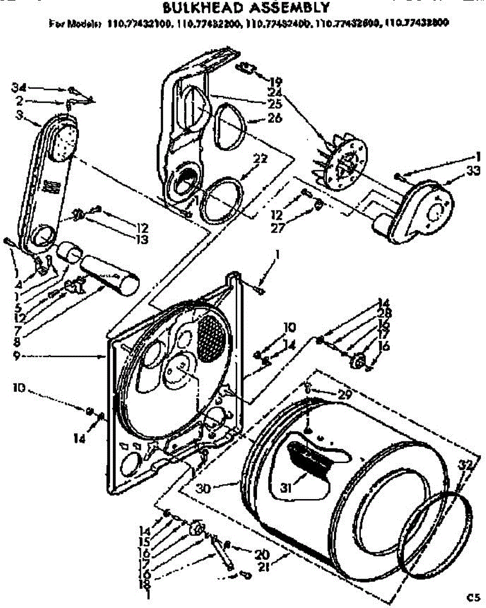 Replacement drum front bulkhead for dryers. Installs at the front of the drum assembly. Needed when original is cracked, damaged, or worn out.