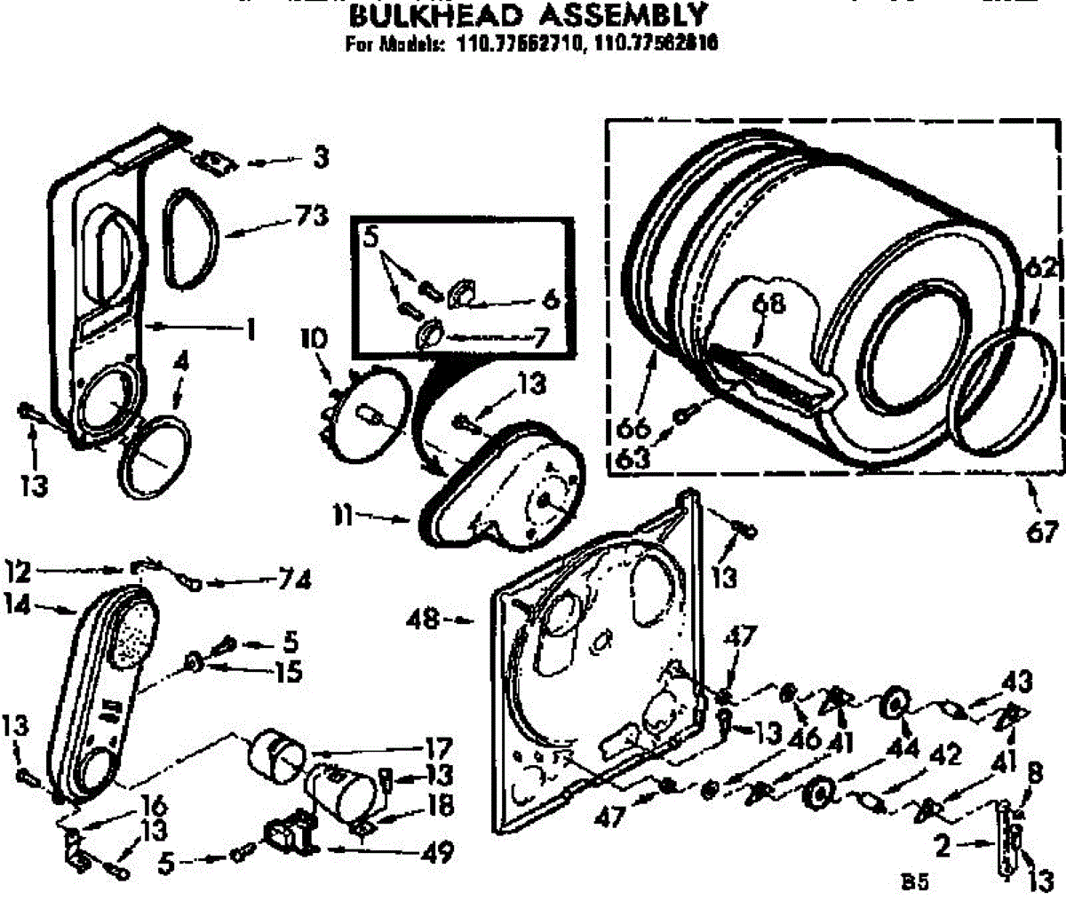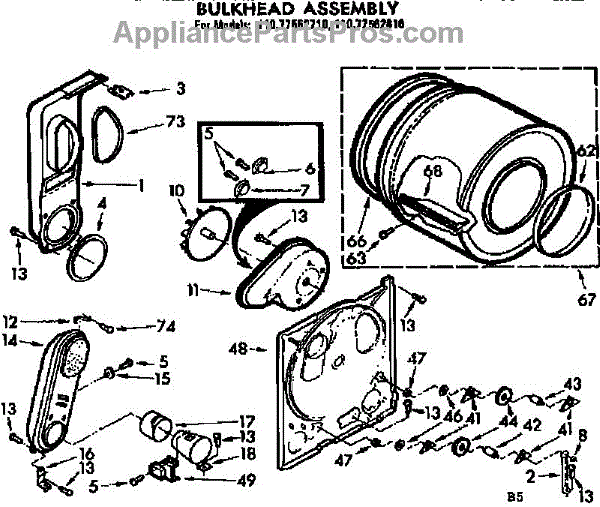 Replacement drum front bulkhead for dryers. Installs at the front of the drum assembly. Needed when original is cracked, damaged, or worn out.