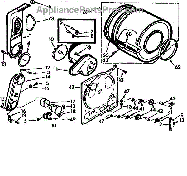 Replacement drum front bulkhead for dryers. Installs at the front of the drum assembly. Needed when original is cracked, damaged, or worn out.