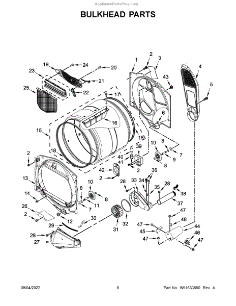 A replacement front drum bulkhead that supports the dryer drum and helps keep the front bearing and seal aligned for smooth rotation. Use this bulkhead to restore proper drum alignment and reduce rubbing, noise, and excessive front play. What it does: