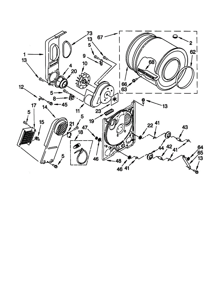 Complete drum assembly for dryers. Houses and rotates laundry during cycles. Replace if cracked, warped, damaged, or worn from extended use.