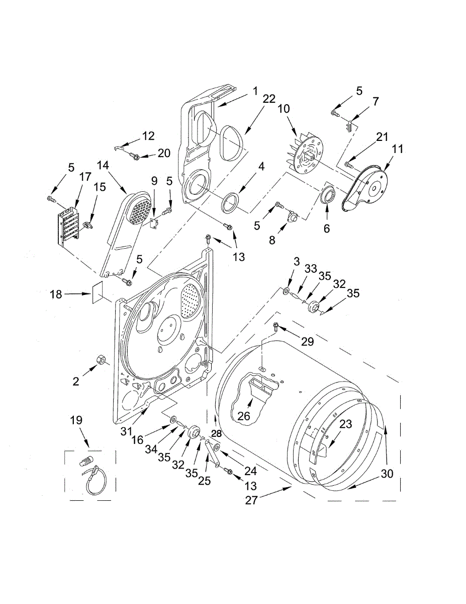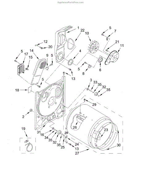 Seals the rear drum edge to contain hot air and improve drying efficiency. Replace if worn, torn, or causing noise. Confirm fit with your model number.