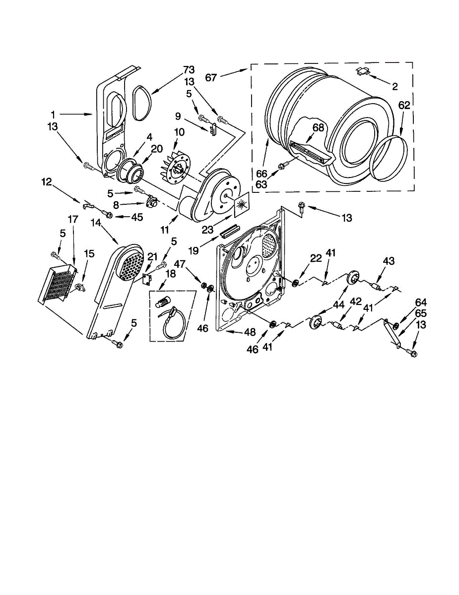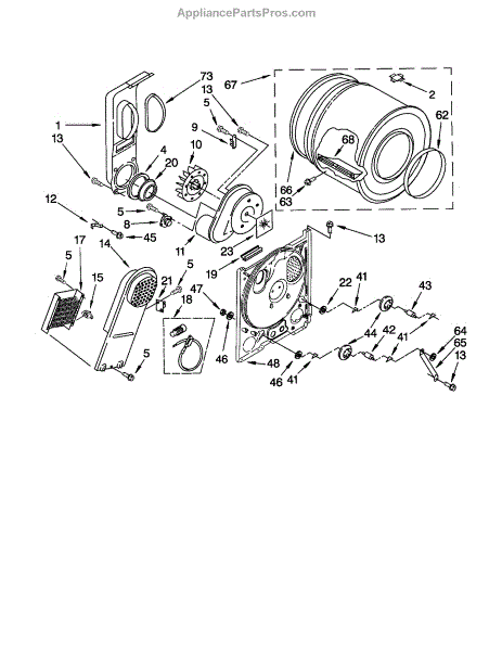Complete drum assembly for dryers. Houses and rotates laundry during cycles. Replace if cracked, warped, damaged, or worn from extended use.