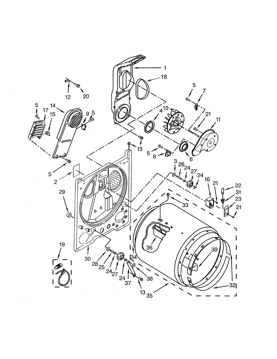 Structural rear panel that forms the back wall of your dryer drum compartment and aids heat retention. Replace if cracked, damaged, or causing noise.