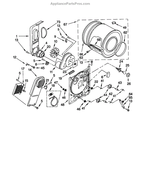 Complete drum assembly for dryers. Houses and rotates laundry during cycles. Replace if cracked, warped, damaged, or worn from extended use.