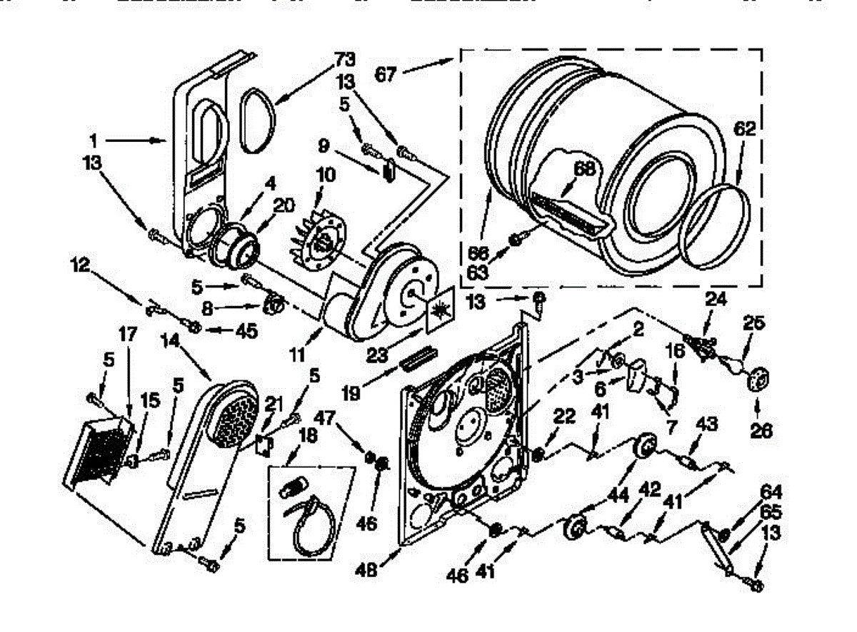 Complete drum assembly for dryers. Houses and rotates laundry during cycles. Replace if cracked, warped, damaged, or worn from extended use.
