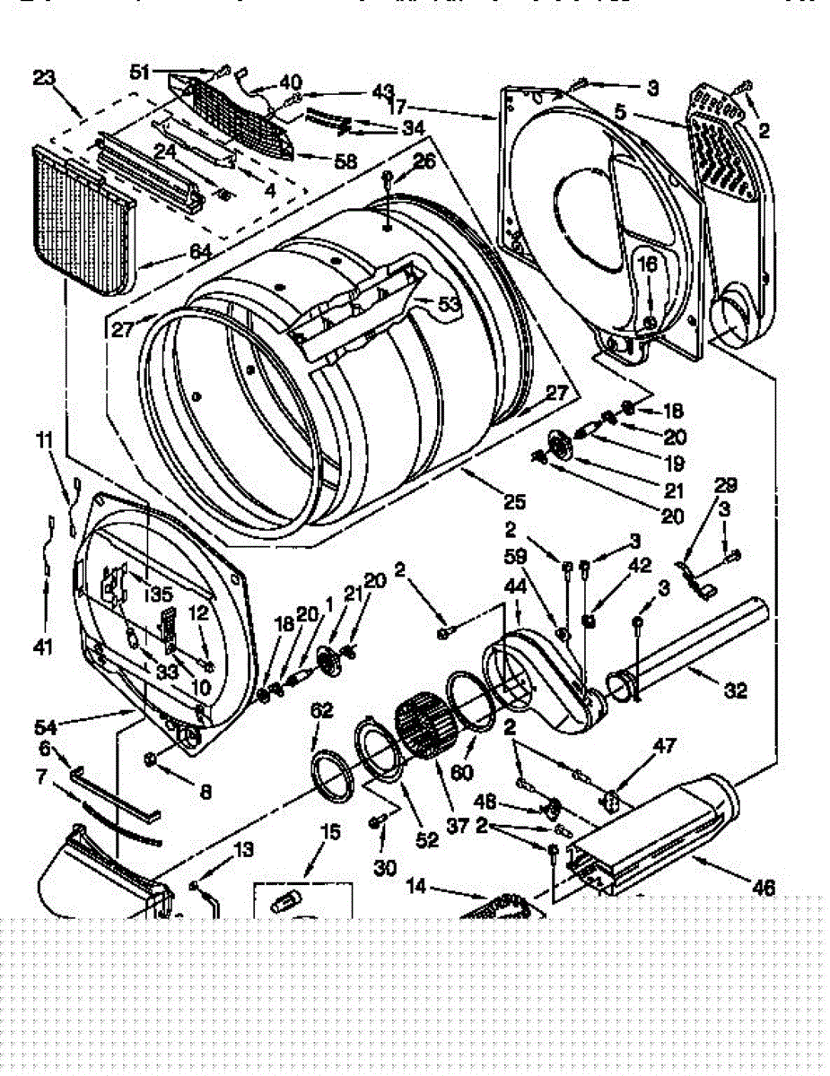 Blower housing assembly that directs airflow from the drum to the exhaust vent. Replace if cracked, damaged, or causing excessive noise in your dryer.