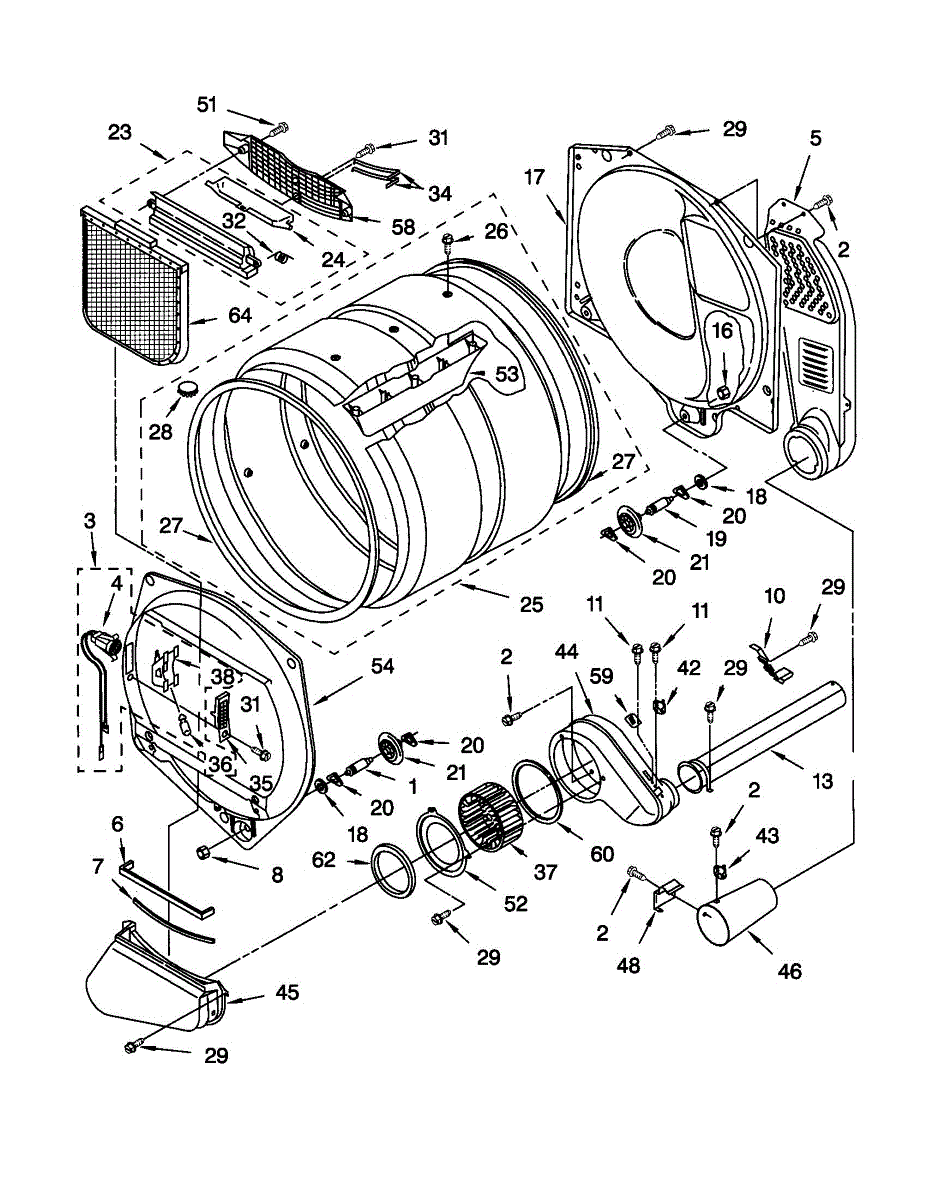 Blower housing assembly that directs airflow from the drum to the exhaust vent. Replace if cracked, damaged, or causing excessive noise in your dryer.