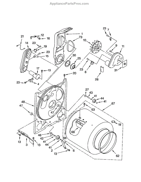 Complete drum assembly for dryers. Houses and rotates laundry during cycles. Replace if cracked, warped, damaged, or worn from extended use.
