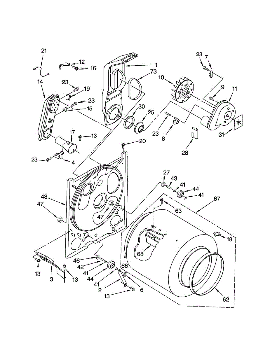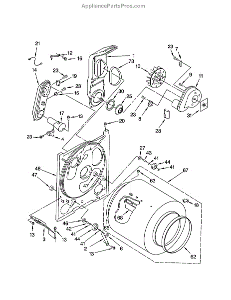 Complete drum assembly for dryers. Houses and rotates laundry during cycles. Replace if cracked, warped, damaged, or worn from extended use.