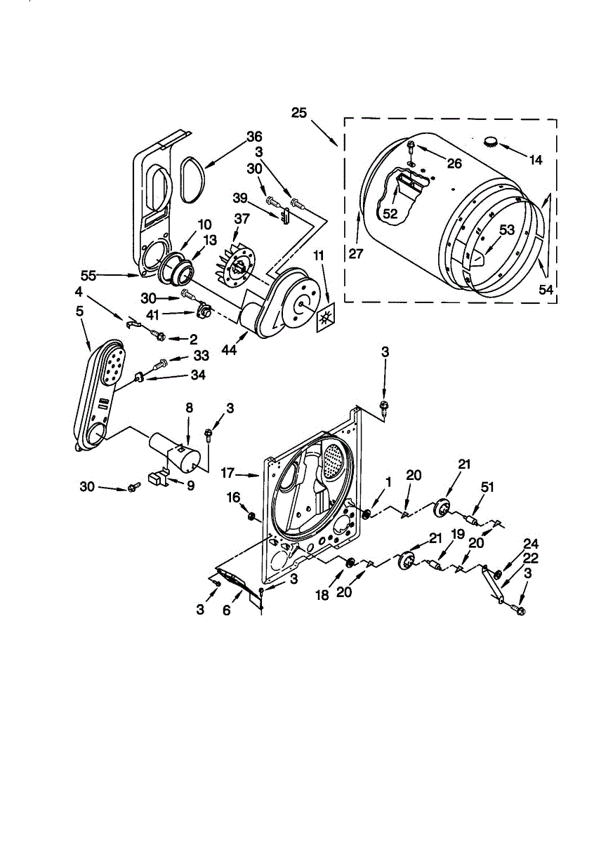 Seals the rear drum edge to contain hot air and improve drying efficiency. Replace if worn, torn, or causing noise. Confirm fit with your model number.